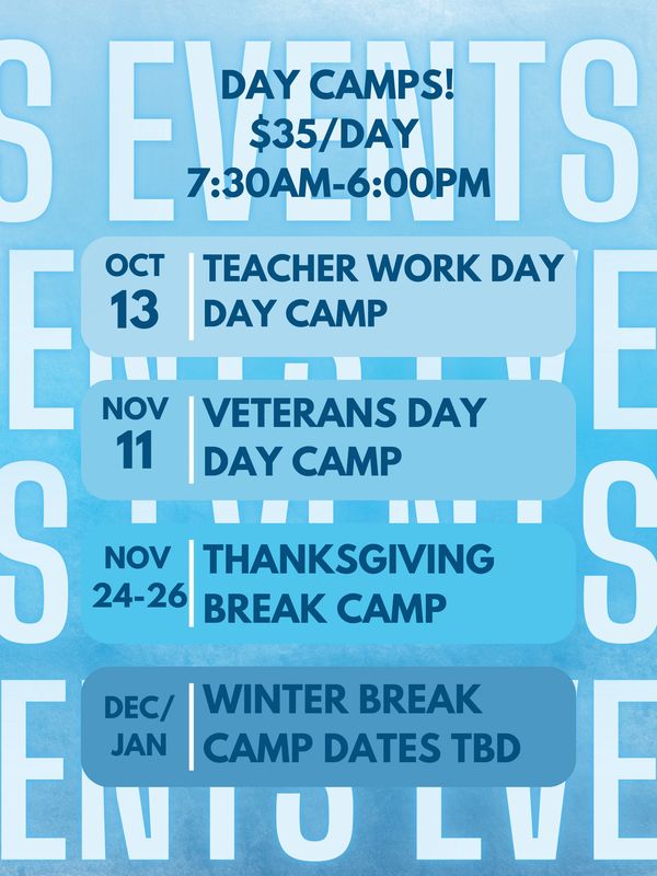 Join us for the best summer ever! Drop off starts at 7:30 am and pickup is at 6pm. We keep them busy and active all day with field trips, classes and free time!